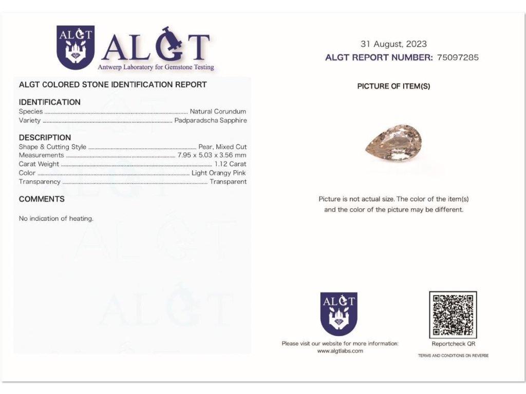 Oranžovo růžový safír 1.12 ct | certifikát ALGT