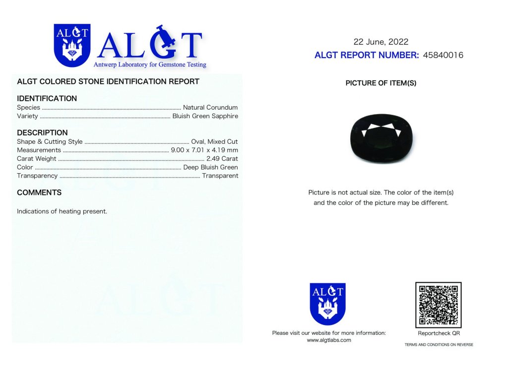 Tmavě zelený safír 2.49 ct | certifikát ALGT
